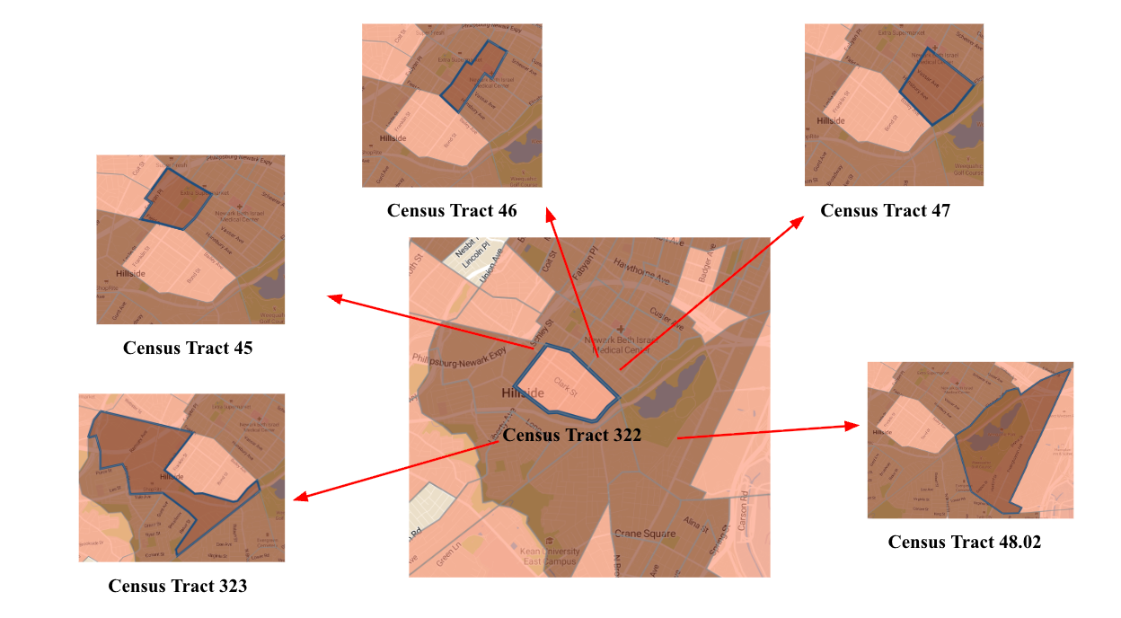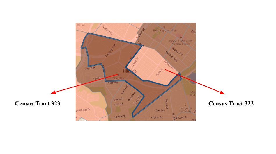 Census Tract 322, located directly adjacent to Census Tract 323, discussed in the prior example, illustrates how a tract may qualify through aggregation with neighboring tracts. Like Tract 323, Census Tract 322 is in Union County, New Jersey, within the New York–Newark–Jersey City Metropolitan Statistical Area (MSA), and therefore does not qualify as rural. It is part of Newark, a city with a population well above 20,000.